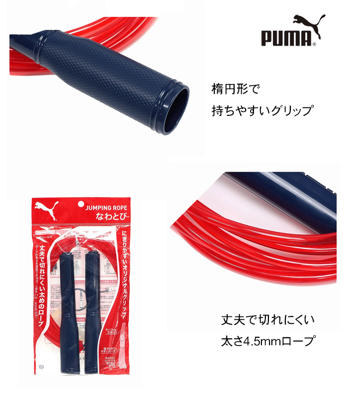 商品名 PUMA プーマ なわとび 素材 グリップ:ポリプロピレン ロープ:ポリウレタン 回転体:ポリエチレン サイズ 長さ2.7M 太さ4.5mm 特徴 握りやすい楕円形オリジナルグリップで切れにくい丈夫な太めのロープ! グリップにはPUMA のロゴがありカッコいいです。