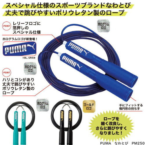 かっこいいプーマのホログラムロゴ入り縄跳び 商品名 プーマ PUMA なわとび 品番 PM250BK ブラック/ PM250GR グリーン/ PM250BL ブルー サイズ ロープ長-最大2.7m グリップ形状-太さ2.7cm×奥行き2.2cmの楕円型、長さ16cm 重さ:約)90g 仕様 名前シールつき 材質 (グリップ)PP、(ロープ)PU、(回転体)PE メーカー クツワ株式会社 ※他のモール及び店頭売りと在庫を併用しておりますのでご注文後でも在庫切れの場合がございますのであらかじめご了承下さい。