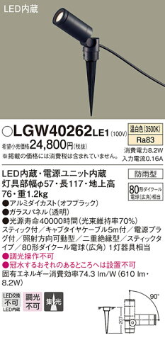 エクステリア 屋外 照明 ライト パナソニック(Panasonic) スポットライト スパイクタイプ LGW40260LE1 電球色 LGW40262LE1 温白色 オフブラック ピンタイプ デザイン 電球色LED スポットライト 玄関灯 門柱灯