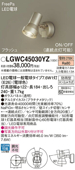 エクステリア 屋外 照明 ライト パナソニック(Panasonic) スポットライト LGWC45030YZ センサーあり プラチナメタリック 人感センサ 防犯照明 電球色LED スポットライト 玄関灯